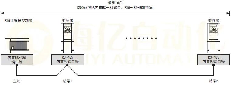 变频器通信功能,就是以RS-485通信方式连接FX5可编程控制器与变频器,最多可以对16台变频器进行运行监控、各种指令以及参数的读出/写入的功能。 • 可以对本公司产变频器: FREQROL-F800/A800/E800/F700P/A700/E700/D700/CS80系列进行链接 • 可以执行变频器的运行监视、各种指令、参数的读出/写入 • 总延长距离最长为1200m(仅限由FX5-485ADP构成时)
