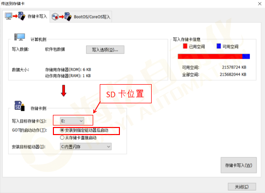 Step 2.选择写入目标存储卡(即SD卡位置),选择好后点击存储卡写入,等待完成,完成后取出SD卡