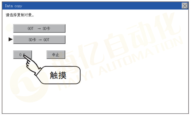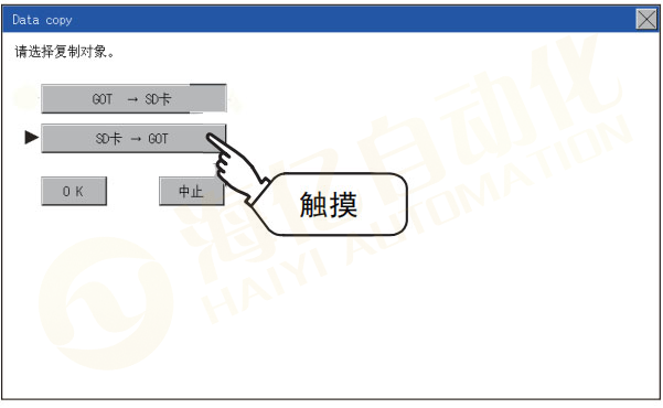 Step 6. 选择复制方向 在选中的按键旁会显示选中标志 GOT→SD卡:从GOT复制到存储板 SD卡→GOT:从SD卡复制到GOT
