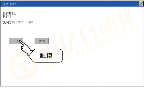 Step 11. 复制已经完成 触摸[OK]按钮后,画面关闭。复制期间发生错误时,会显示错误信息。 仅将工程数据复制到GOT时,触摸 [×]按钮后,GOT会重新启动,并显示用户创建画面。将基本系统应用程序复制到GOT后,GOT会自动重新启动,并显示用户创建画面。 (工程数据不存在时,会显示工程数据不存在的信息。)