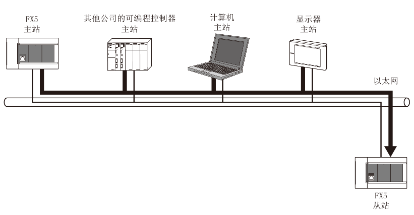 MODBUS/TCP通信功能(可做主从站功能) 使用FX5的MODBUS/TCP通信功能时,可与将FX5作为从站并通过以太网连接的各种MODBUS/TCP主站设备进行通信。 ❶对应主站功能及从站功能,1台FX5可同时使用为主站及从站。 ❷台CPU模块中可用作MODBUS串行通信功能的通道数最多为8个连接。 ❸在主站中,使用通信协议支持功能控制从站。