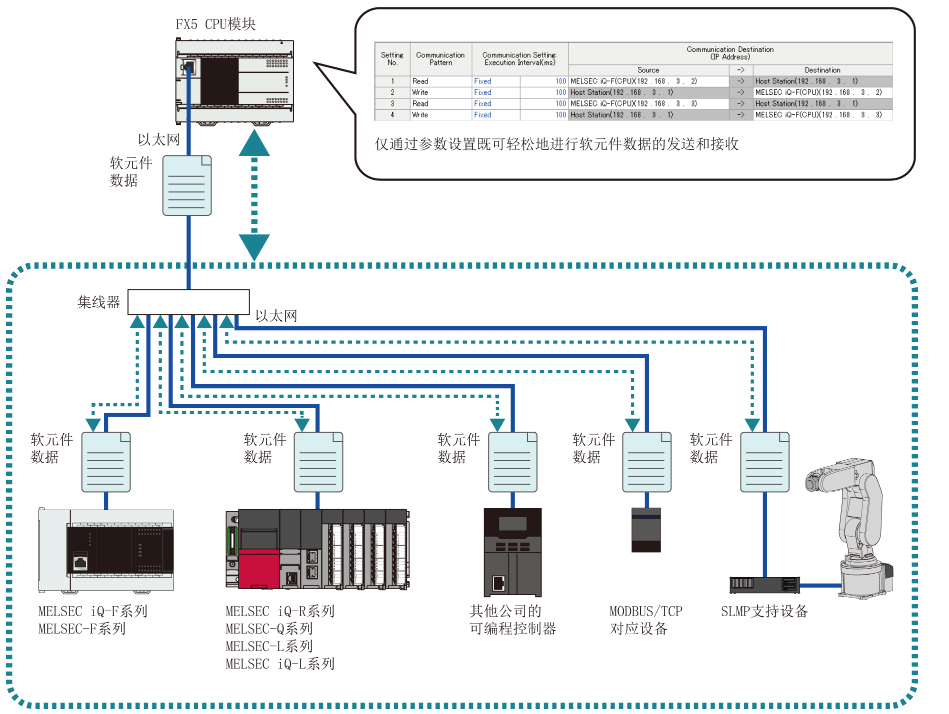 简单CPU通信功能 可以使用以太网端口与通信对象设备进行连接,并以指定的时机对指定的软元件数据进行发送和接收。 仅通过GX Works3进行简单的参数设置,即可以构建无程序的通信系统。