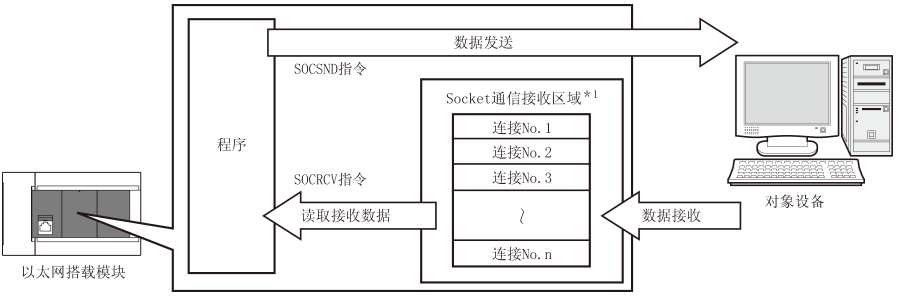 Socket通信功能(套接字,或无协议通信) 通过专用指令与通过以太网连接的对象设备以TCP及UDP协议收发任意数据的功能。