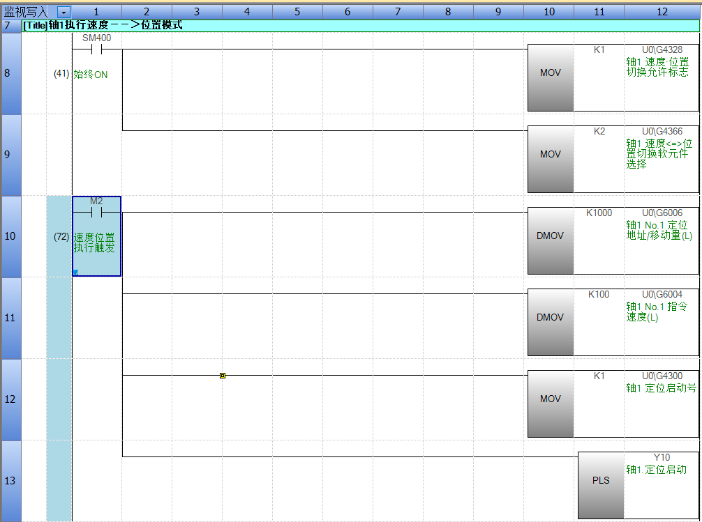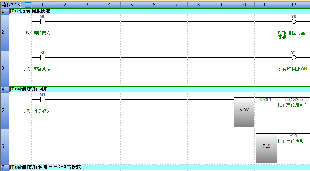 前言 此次使用三菱软件模拟功能进行功能演示,无需硬件,应用场景。 什么叫速度模式? 答:伺服的速度模式类似变频器控制普通马达一样,控制其速度大小与方向,而不关注跑多远,然而伺服的速度模式不仅能指定速度和方向,还能进行输出转矩的限制。 那什么是位置模式? 答:位置需要一个参照物,我们相对于参照物有一个绝 对的距离,这个距离叫做绝 对位置,按控制来说就是绝 对定位。如果没有这个参照物的情况下以自身作为参照时,我们向任意方向所走的距离,所走距离就是相对距离,其控制就是相对定位。 那我们什么时候会用到速度位置模式呢? 答:当事先不知目标位置的距离,但知道要去的方向以及在这个方向上会经过一个特殊的标识点,而经过这个标识点后获得了目的地或标识点的距离时,我们就可以用到速度位置模式。 这样用有什么优势? 一、可以减少机械安装的精度要求,因为我的位置其实是每次都以固定的标识点在定位; 二、可以减少因多次运行而造成的累积误差,因为我们的位置每次都在以固定的标识点(原点)做相对定位。